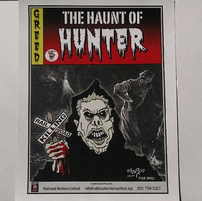 Even from the grave, the legacy of Hunter Harrison haunts the rail industry in North America! Letter size (8.5 X 11) poster in full color on 32 lb premium laser gloss paper . Mike Konopacki - premier labor cartoonist in North America - has drawn this cartoon exclusively for Railroad Workers United.