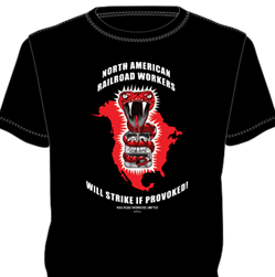 Full color front logo: "North American Railroad Workers: Will Strike If Provoked". Union made in the USA BLACK T-shirt is available in sizes -- Small (sold out), Medium (sold out), Large, X Large, 2X Large, 3X Large and 4X Large. The shirt was designed by RWU members with assistance from the premier labor cartoonist in the United States, Mike Konopacki. We use a union shop supplier, Image Pointe of Waterloo, IA. Shirt will be shipped special direct from the factory. Please allow 3 -4 weeks for delivery.