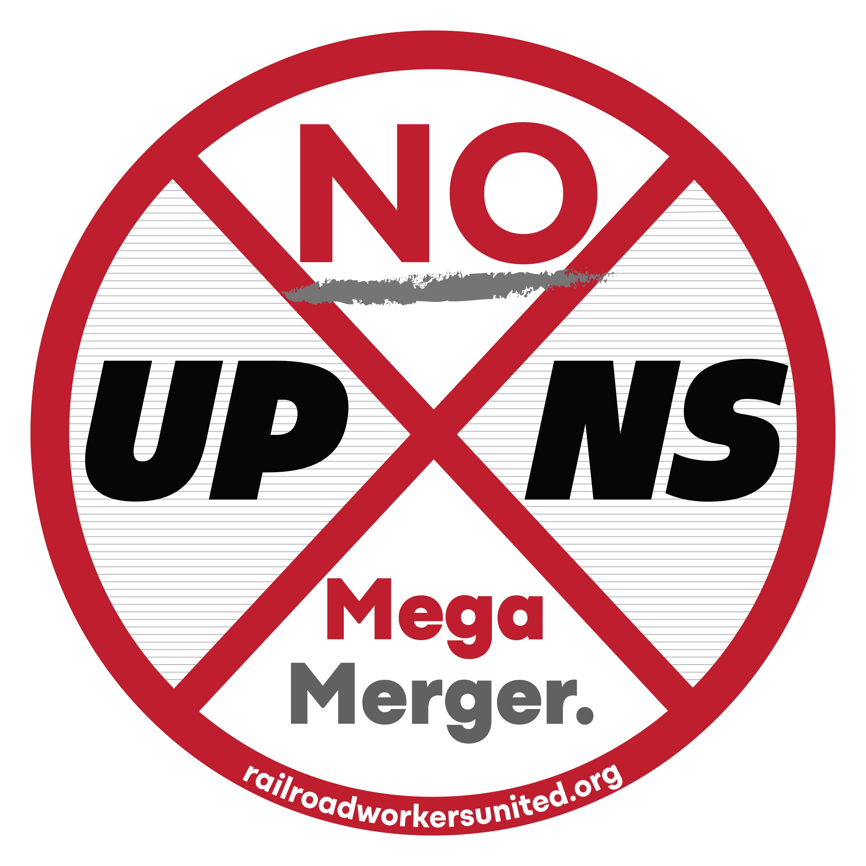 Round 2.5" sticker with red and black lettering on grayscale background with the slogan "NO UP-NS Merger". Show your opposition to this proposed mega-merger, and stand up for shippers, passengers and RAILROAD WORKERS!. This round lapel sticker (2 1/2" in diameter) is perfect to wear as a lapel sticker, or works great on hard hats, lunch boxes, lockers, bulletin boards, or other highly visible locations in the workplace. They come in sheets of twelve (12) stickers.