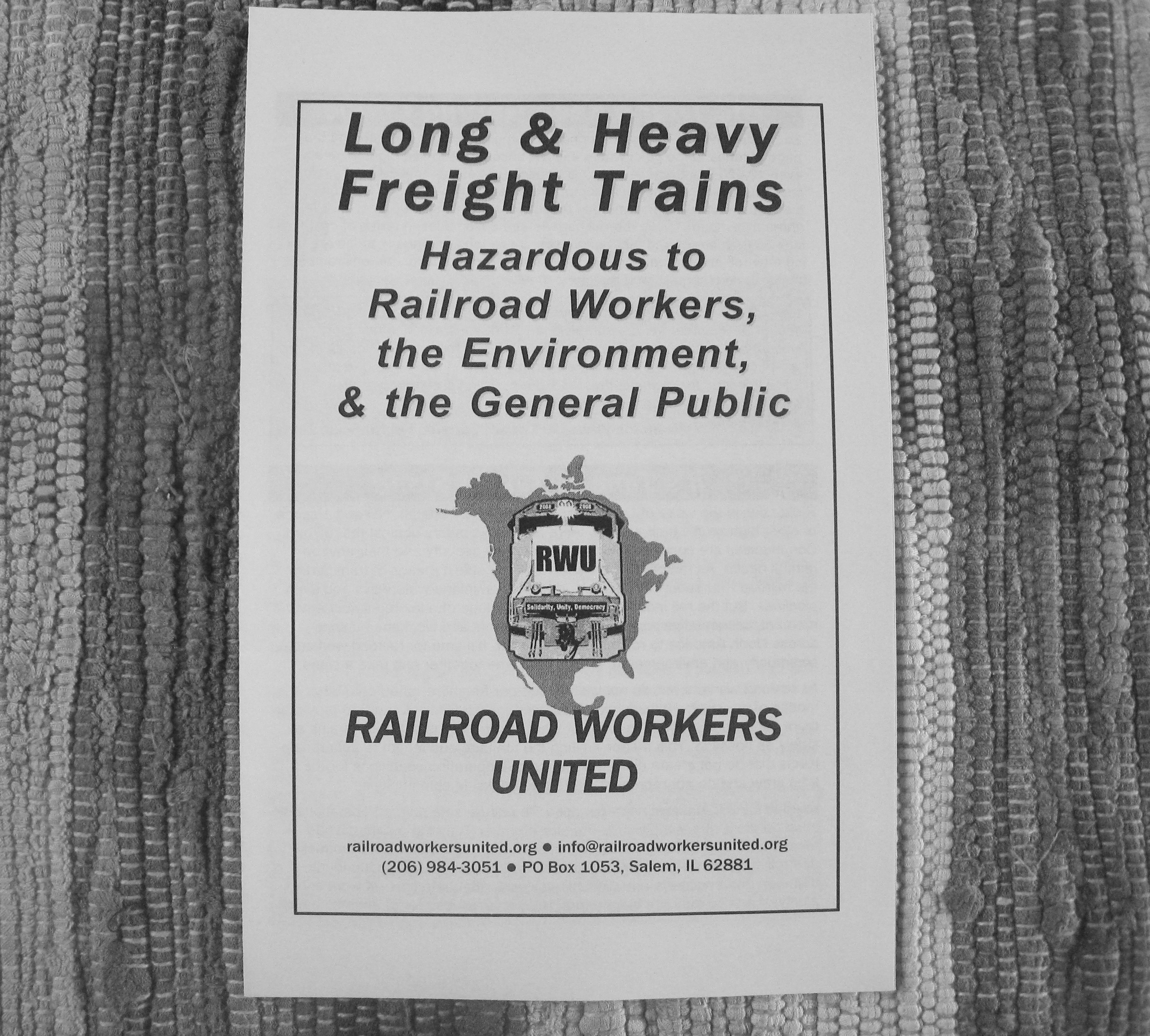 FLYER (25 copies): "Long & Heavy Freight Trains: Hazardous to RR Workers, the Environment & the General Public"