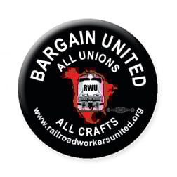 This pin-on button is white lettering on black background with the full-color RWU logo and the words: Bargain United: All Unions, All Crafts." Small size 1 1/4" diameter. Wear yours to work with pride and show the rail carriers and your co-workers how you feel about standing together in solidarity. Limited supply available.