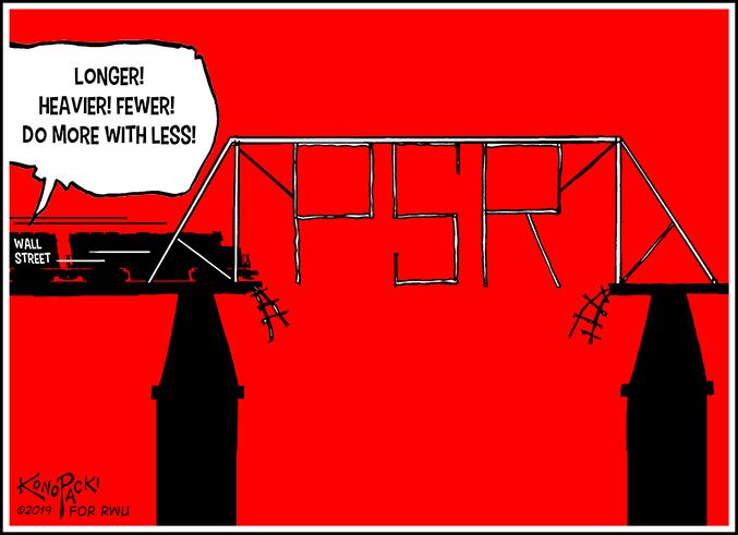 PSR wants to do "more with less" and puts safety at risk! Letter size (8.5 X 11) poster in full color on 32 lb premium laser gloss paper . Mike Konopacki - premier labor cartoonist in North America - has drawn this cartoon exclusively for Railroad Workers United.