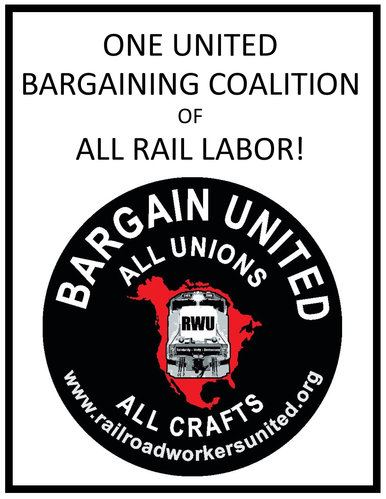 Letter size (8.5 X 11) poster on 32 lb premium laser gloss paper with the slogan "RAGAIN UNITED; ALL UNIONS, ALL CRAFTS. with RWU button logo and contact information on WHITE background. Great for bulletin boards in locker rooms, shanties, break rooms, etc.