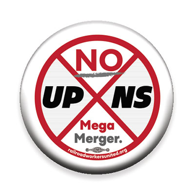 This pin-on button has red and black lettering on grayscale background with the slogan "NO UP-NS Merger". Show your opposition to this proposed mega-merger, and stand up for shippers, passengers and RAILROAD WORKERS! Available in a small 1 1/4" diameter button size. Wear yours to work with pride and show the rail carriers and your co-workers how you feel about this proposed mega-merger. Limited supply available.